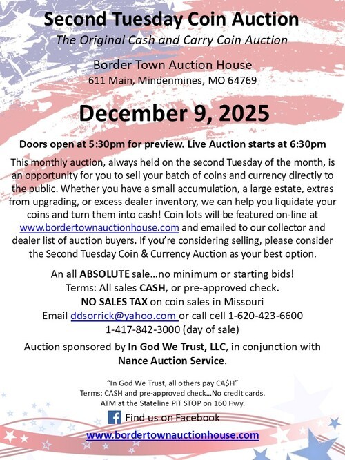Our regular “CASH ONLY” absolute auctions featuring coin estates, collections, and dealer over-stock.